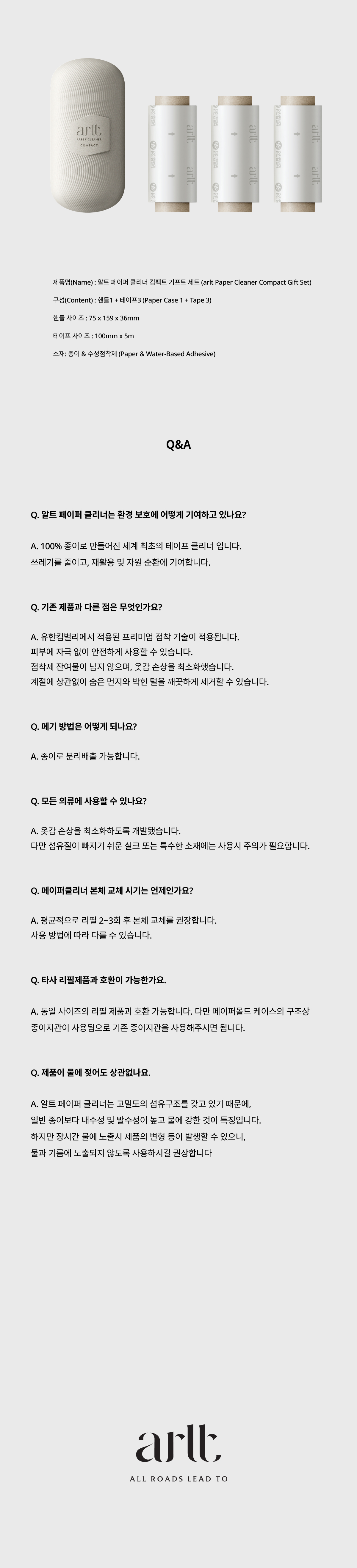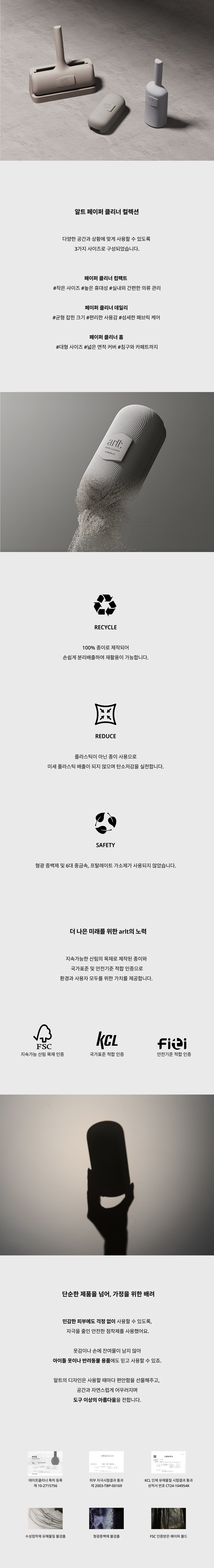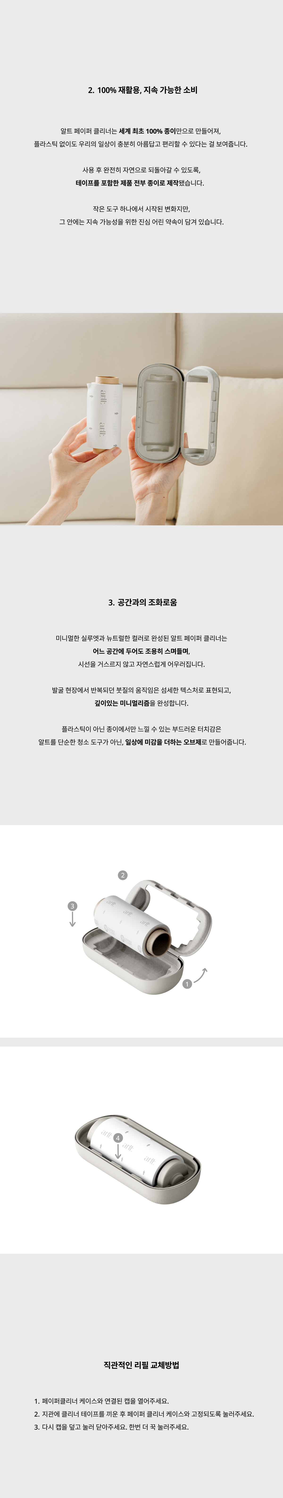 arlt 페이퍼 클리너는 올페이퍼 소재로 만들어진, 가장 친환경적인 테이프 클리너입니다. 지속 가능성을 실천하는 하이엔드 오브제로써 오직 종이로 구현됐습니다.